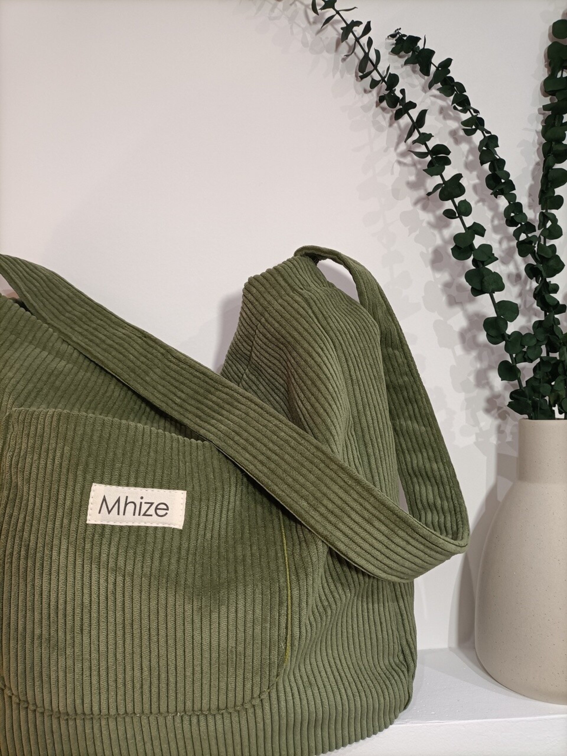 Es una bolsa moderna y juvenil. Confeccionada con un tejido tapicero de pana y con un asa larga para llevarla al hombro o como bandolera.